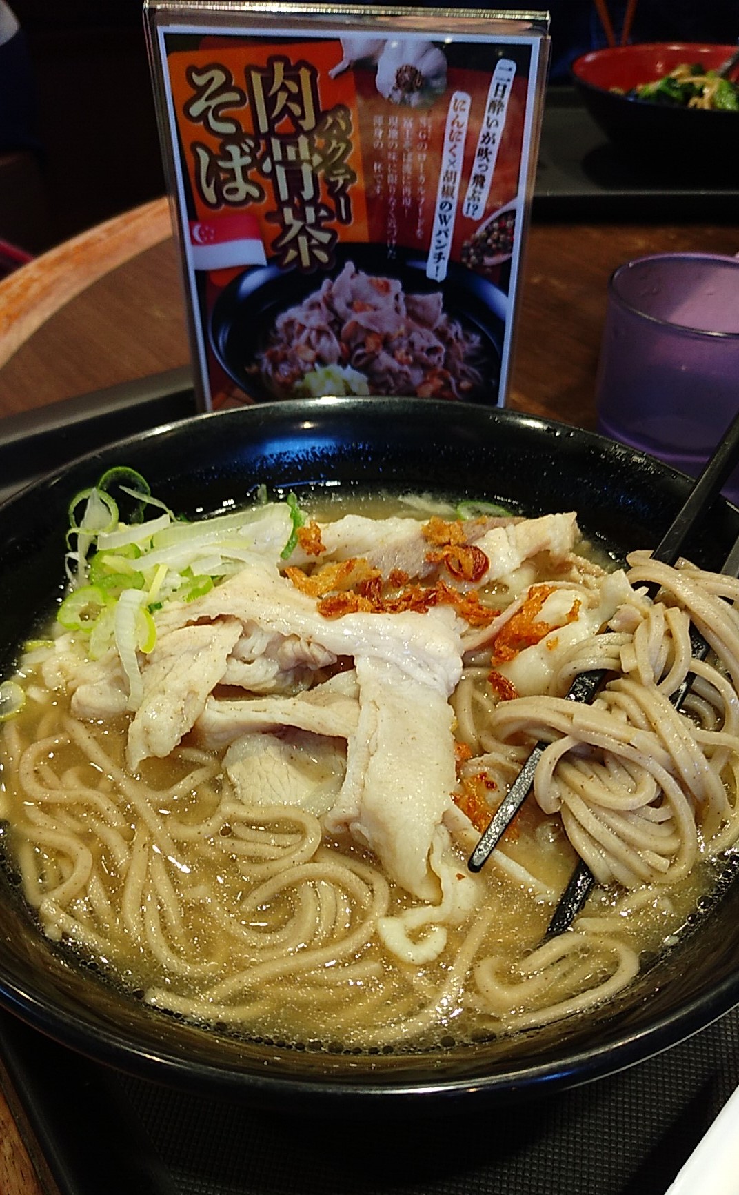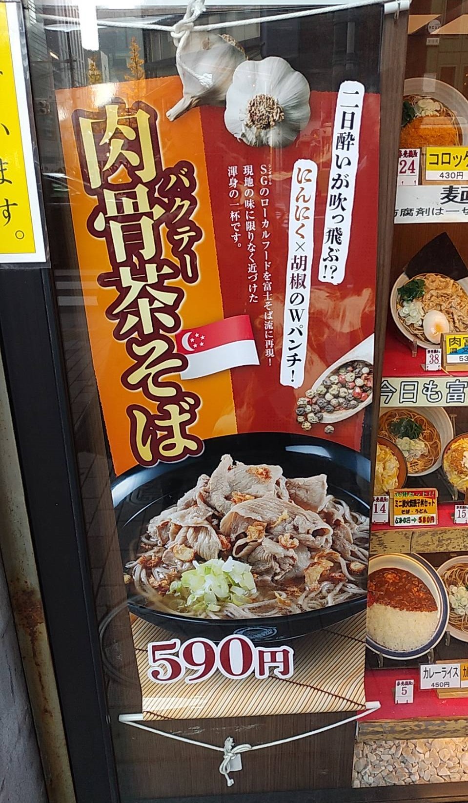 蕎麦と思って食べると、「うっ何だか違う???」バクテーと思って食べても「なんだこれは??」と、いささか何とも形容し難く、どちらにも「別物感」がぬぐえない一口目でしたが、食べ進むうちに妙にインパクトが強くて頭にガツーンと印象に残る味となりました。聞くと蕎麦つゆは一切使わず、豚を主としたラーメンのスープがベースだとか。これはシンガポール好きの富士そばさん、かなりのチャレンジだったのではないでしょうか?