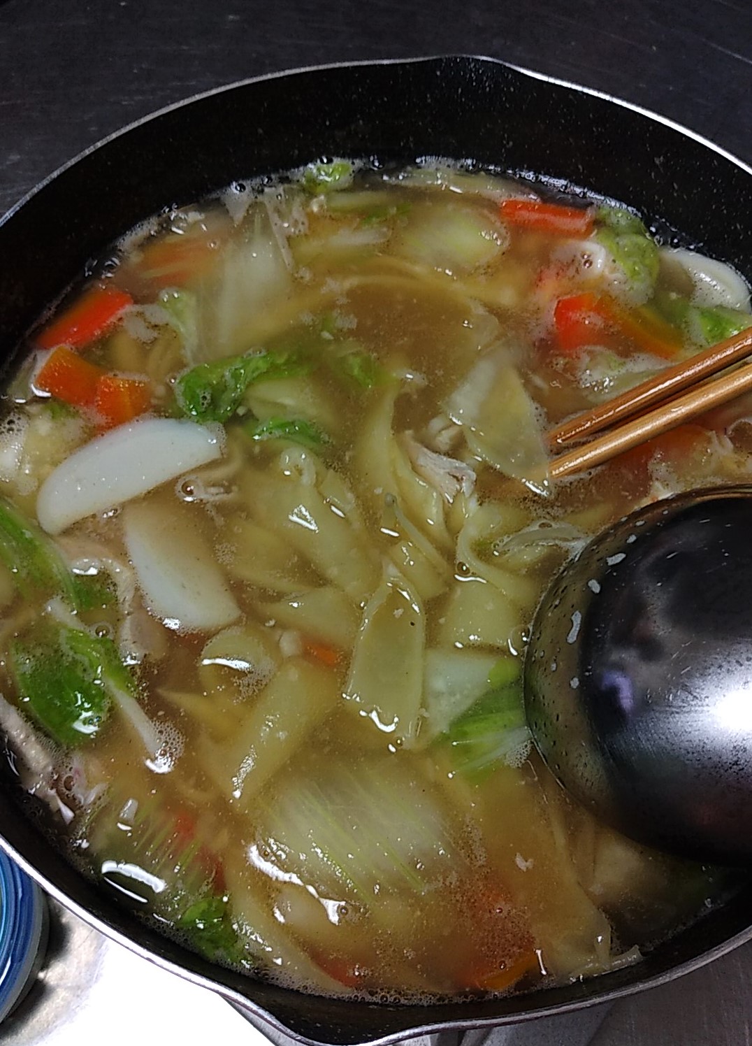 タピオカ麺ですからグツグツ煮込んでも最後までつるつるモチモチ。トッピングには錦糸卵や鍋用の海苔を加えて色鮮やかに。かまぼこも入った長崎ちゃんぽんのモチモチ麺バージョンといった感じです。