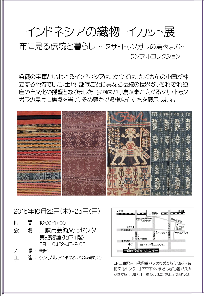 今回は「布に見る伝統と暮らし~ヌサ・トゥンガラの島々より~」と題したイカットの展覧会です。ヌサ・トゥンガラとはバリ島以東に東西に連なる島々のことで、主な島にコモド・ドラゴンで有名なコモド島、スンバ島やフローレス島などがあります。