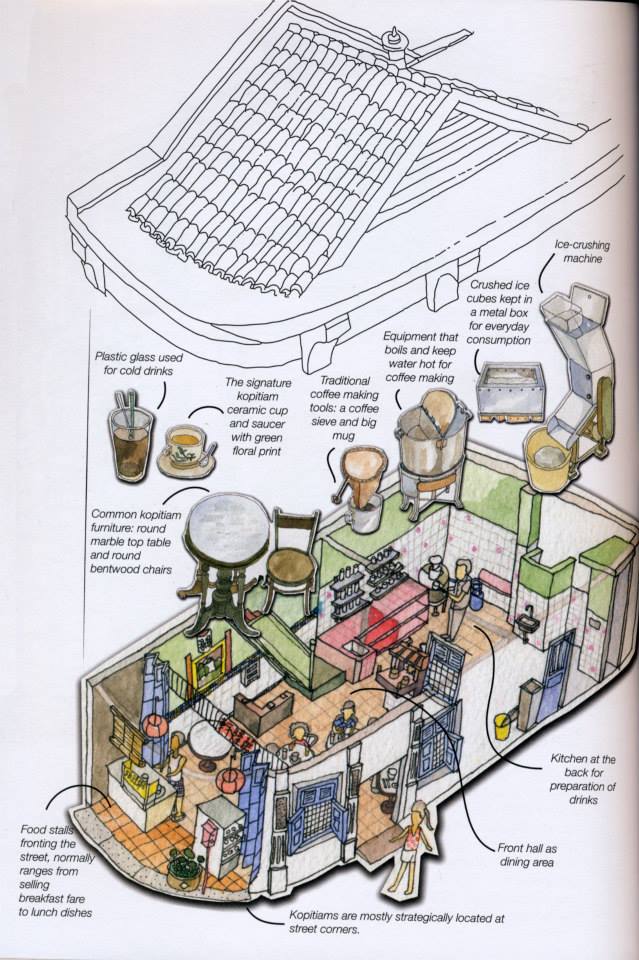 また、今回の本では、シンガポールではありませんが、ペナンで今引っ張りだこになっているLuisa Hungさんにホーカーセンターとコピティアムのイラストを特別にお願いしました。Luisaさんは台湾出身で建築学が専門、ペナンの歴史的建築修復の建築事務所に勤めていた方ですが、ユニークな建築イラストが話題となり、画集も出版されています。ローカル文化を掘り下げて取材し、じっくりデッサンされて描き出すイラストが本当に味わい深いのです。超売れっ子なので大変厳しいスケジュールだったのですが、なんとかこちらのお願いに応じていただけて実現いたしました。