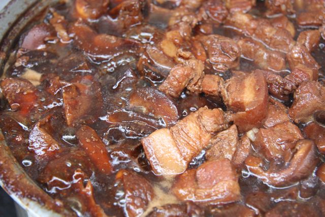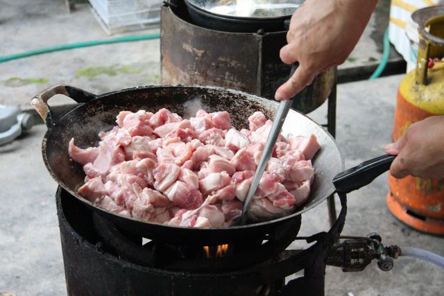 6キロくらいあるという豚肉の山。これをかき混ぜるのは至難の業です(私には無理でした)。でもここのおばさんは何でもないかのように肉を炒めていました。