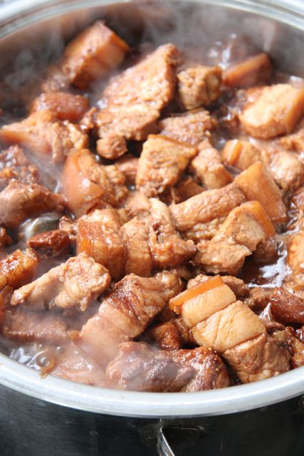 キャラメリゼした豚肉に水、漢方を加えて1度沸騰したら蓋をせず、途中丁寧にあくを取りながら沸騰させないようにコトコト煮込みます。