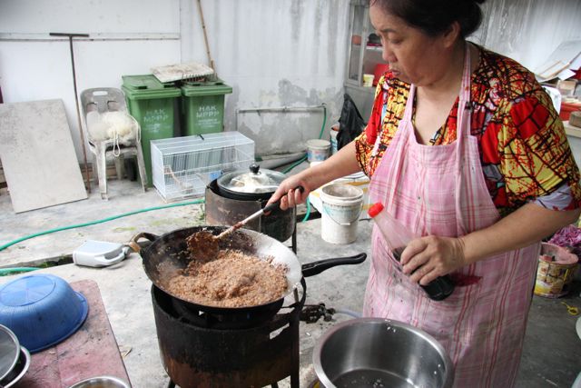 肉を煮ている間におばさんは餅米の準備に。干しエビとニンニクを炒めたところに餅米を加えてしばらく炒めます。
