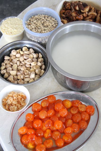 主な材料です。餅米、栗、干しエビ、にんにく、豚肉、そして下のオレンジ色はアヒルの塩卵の黄身です。