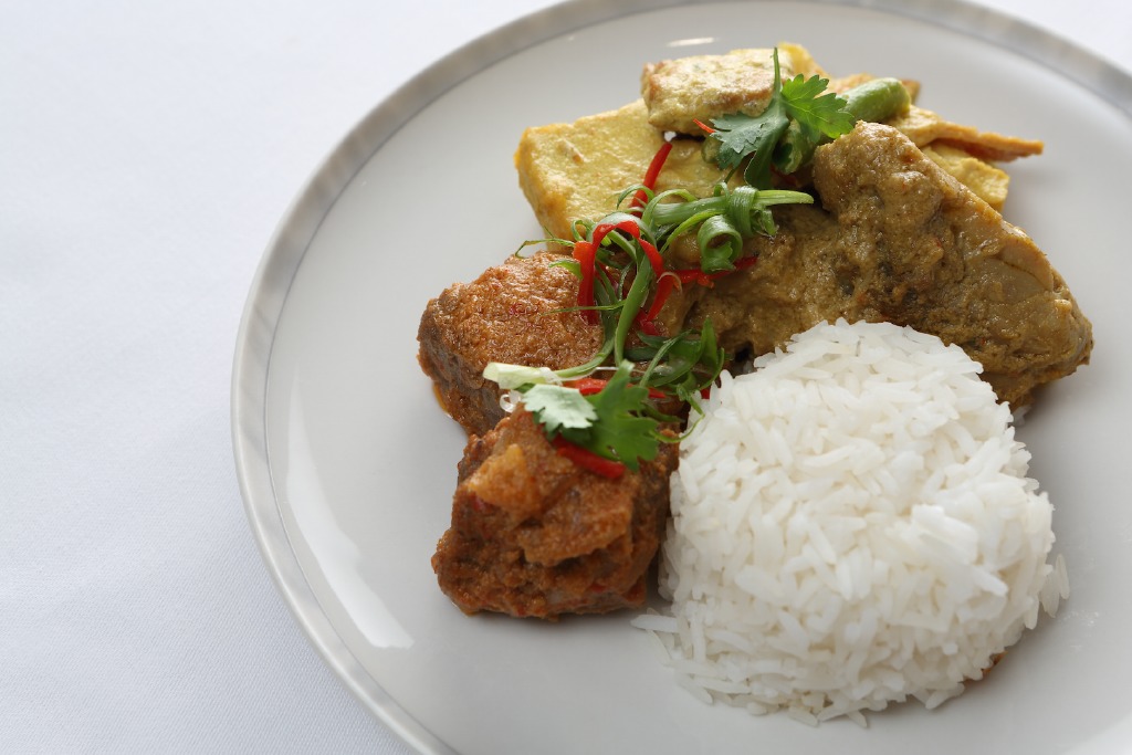 インドネシア・スマトラ島パダン発祥の料理。インドネシア料理にも深い影響を受けたニョニャ料理。こちらもご飯にルンダン(肉のココナッツ煮込みなど)スパイスがきいた様々なおかずの盛り合わせ。