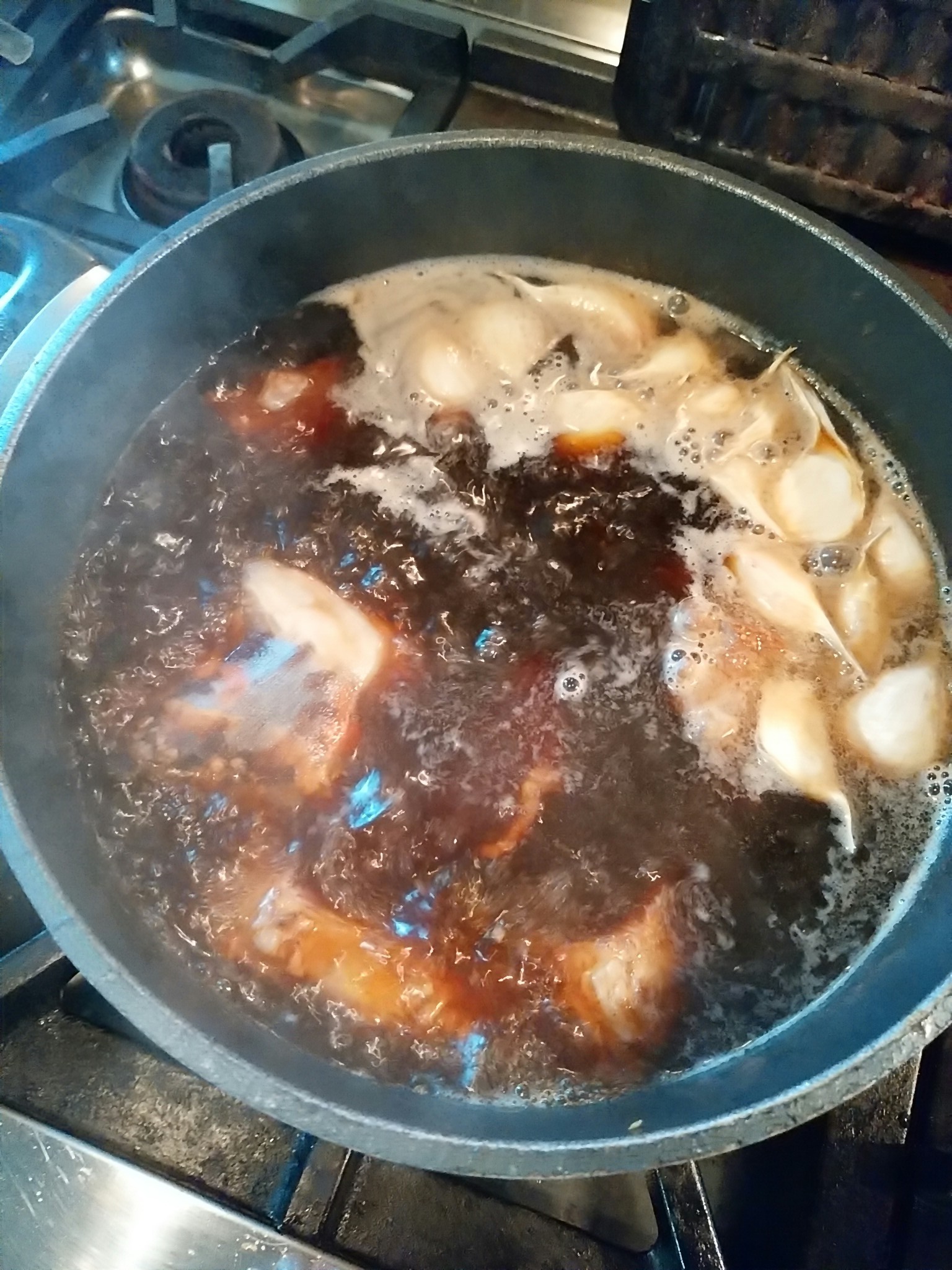 そのあと薄口しょうゆや黒醤油、塩、皮をむかない丸ごとのにんにくを加え、さらに1時間半ほど蓋をせず静かに煮込みます