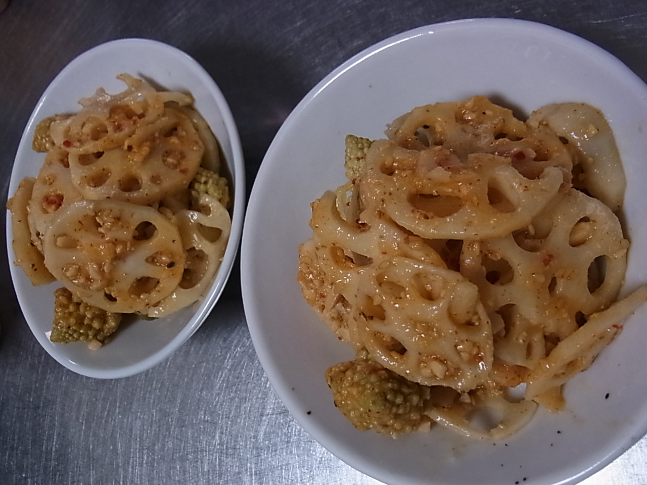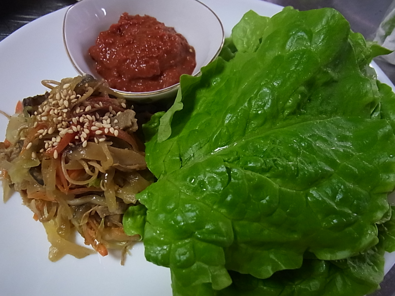 自家製のサンバルブラチャンをつけて、炒めた野菜をレタスに包んで頂きます。日本ではバンクワンが手に入りにくいので、それに良く似た食感のヤーコンで代用されていました。