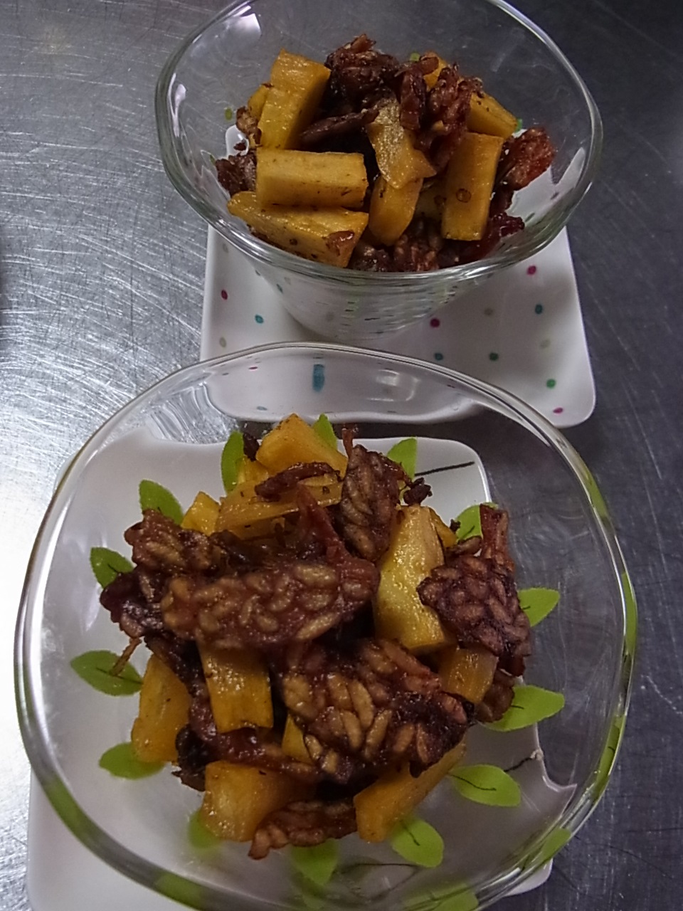 ポテトと揚げたテンペのカリカリの食感が楽しいビールのおつまみです。
