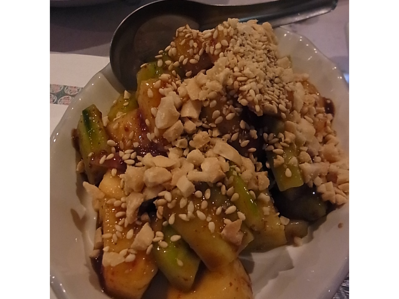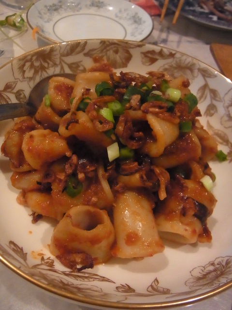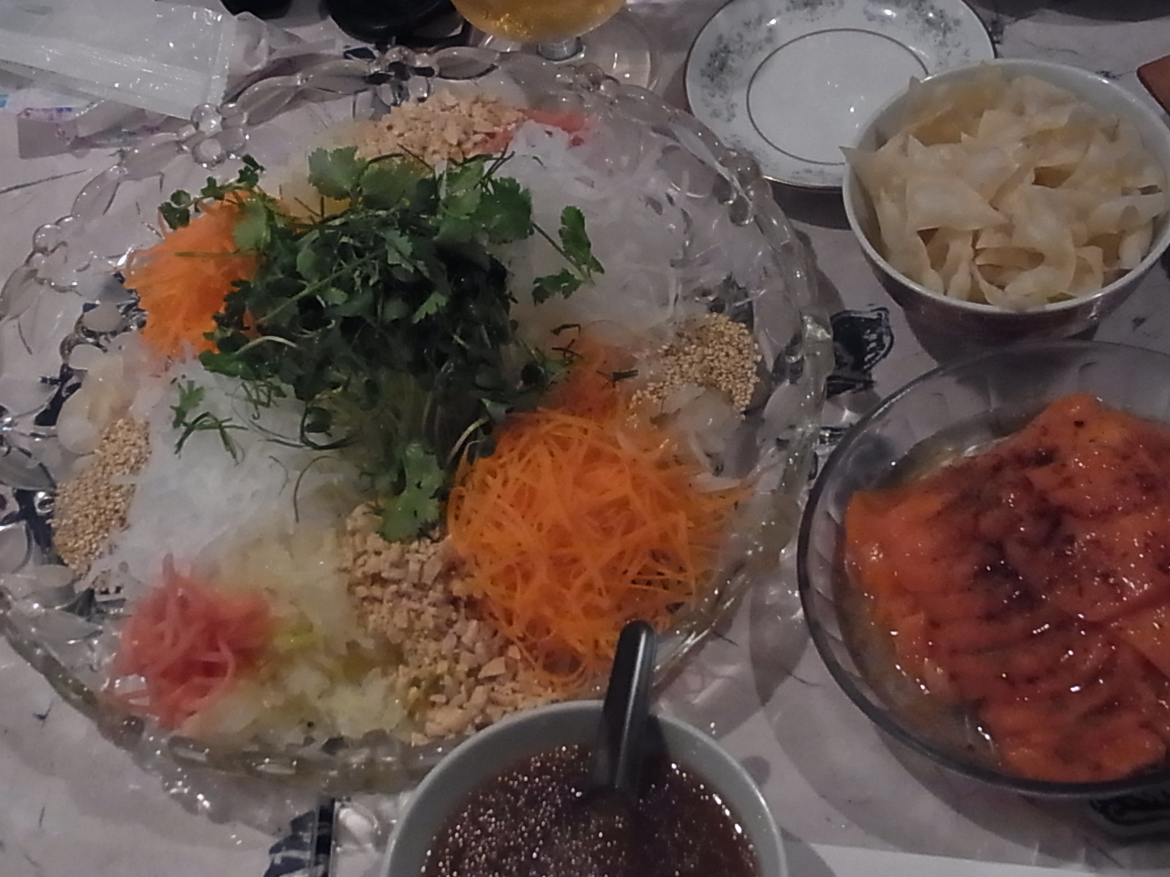 ワンタンの皮を揚げたものとナッツ、極細切りにした野菜をリークイから頂いた1年かけて作られた潮州風梅醤などを加えてぐちゃぐちゃに混ぜ、皆さん来年の願い事を言い合いながらうず高く持ち上げて祝いました。