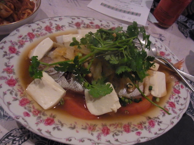 メインディッシュの最初は、尾頭付きタイを使った潮州風蒸し魚。