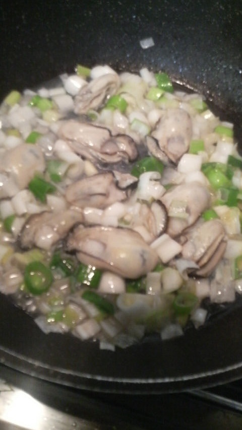 ●油をひいたフライパンに長ネギやニンニク、薄口しょうゆ少々とともに、牡蠣を強火で炒めます。