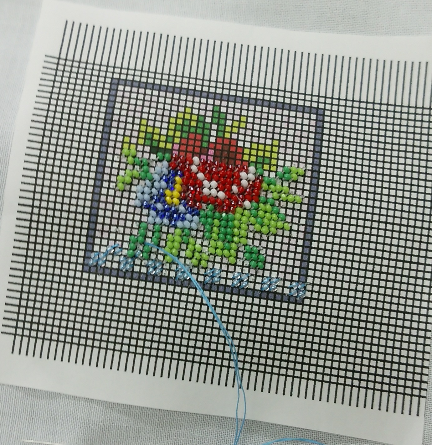 すでに3回目の参加ですので、スイスイ~楽々と刺繍が進み~と書きたかったのですが、今日もビーズがあまりにも小さく、マレーシアに長いこと住んでいらした面白くて素敵な方々が何人もいらして、話に華が咲きすぎてしまい3時間の間に出来たのが僅か数段という情けない有様。