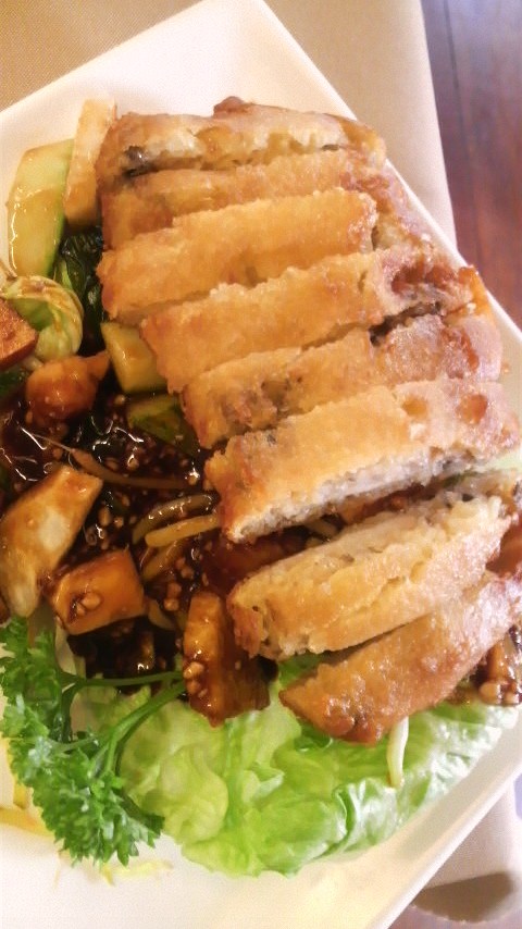 こちらはとんかつ風の料理。メニューにはクリスピーチキン載せロジャサラダとありましたが(笑)ソースがまったりと甘いのはロジャソースをかけているからですが、もちろん肉ではありません。