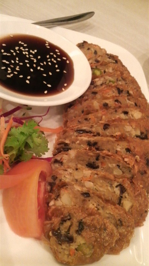 普通は叩いて細かくした豚肉に五香粉などで味を付け、湯葉で巻いて揚げた福建料理の代表的なものですが、これは大豆たんぱくの中に木クラゲやお米やお豆などが入りひき肉風に仕上げてあり、ぷちぷちとした食感が良いアクセントになっておりました。
