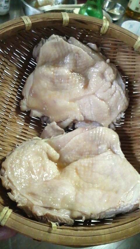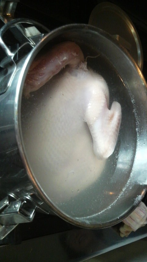 まず軽く塩をしておいた1.5kgもある丸鶏を、香味野菜などを入れて沸騰したお湯に入れて煮込みます。このように大きな鍋に一羽入れるのがやっとの鶏でした。