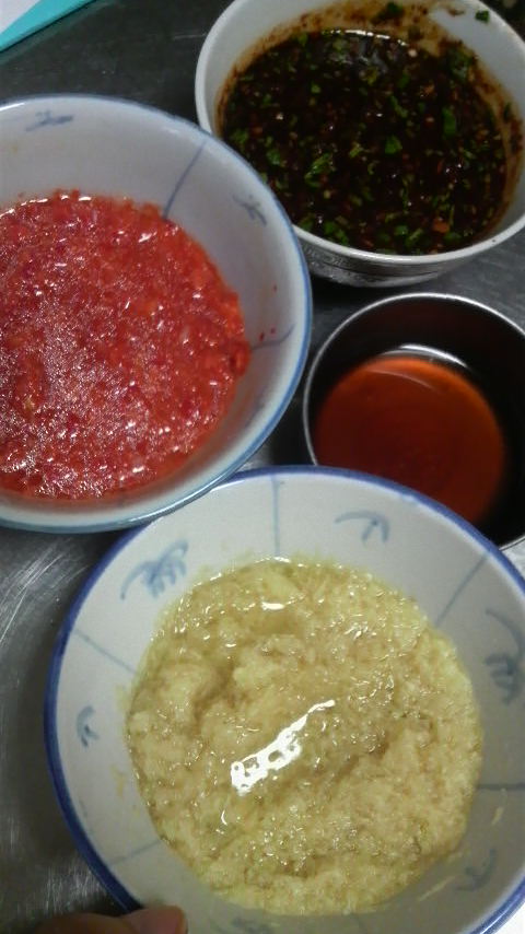 その間に漬けダレとなるジンジャーソース、チリソース、平岡シェフがタイで味わったという醤油ベースのタイ風のタオチオ・ソースの3種類を作ります。