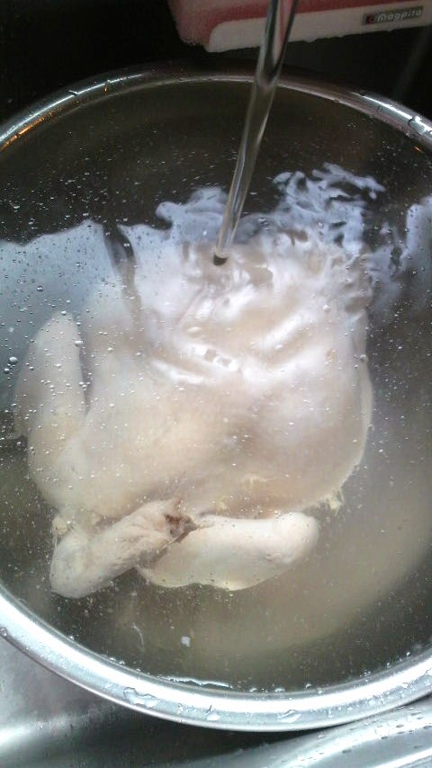 途中、茹であがった鶏を取り出し、流水にさらすこと約30分。この流水にさらす~というのがポイントのようです。流しっぱなしのお水ですが、ジャージャーではなく、このようにちょろちょろでOK!