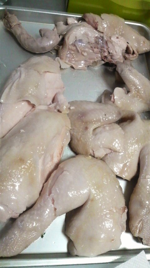 流水にさらすのが終わった時点で、鶏の水分を良く拭き取り、表面に香りオイルを塗り乾かないようにしておきます。これは腿肉。