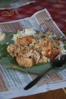 散策中に朝ご飯を売っている家を見つけたので、トライしてみました。ひっきりなしに村民が買いにきていて、ちょっとした行列ができていたのに、お店のお婆ちゃんはあきらかによそ者の私と友人を優先してご飯を出してくれました。クランタンでは一般的なNasi Berlaukという、おかずのぶっかけご飯です。私はお婆ちゃんお勧めのチキンカリーをかけてもらったもの。食べてたら、お婆ちゃんが「これもおいしいよ」とイカン・ビリスのサンバルもサービスしてくれました。連れはラクサムという麺料理を食べたのですが、2人でRM3.50。安すぎない???これ、特別サービスですか?それともこれがカンポン価格?街中で食べると倍はしますよ。
