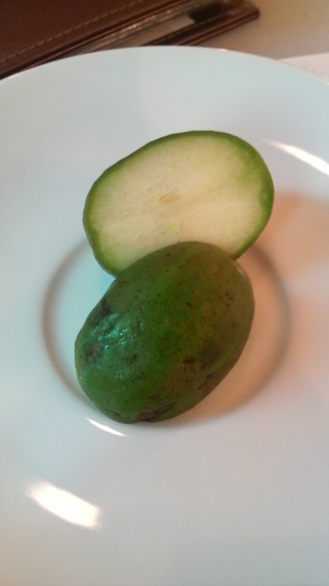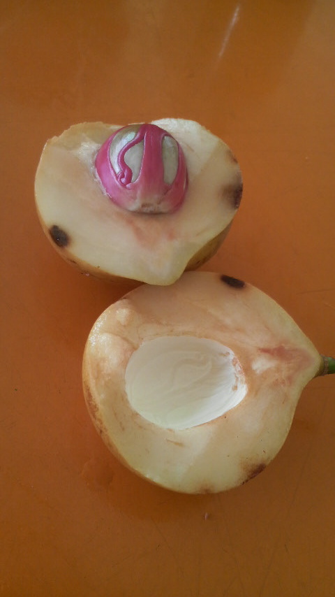 中国語では「人面子」と書いてありますね。なにやらすごい名前です。Kedondongの大きさは卵を一回り大きくしたくらいで、実を半分に割ると中は真っ白でした。