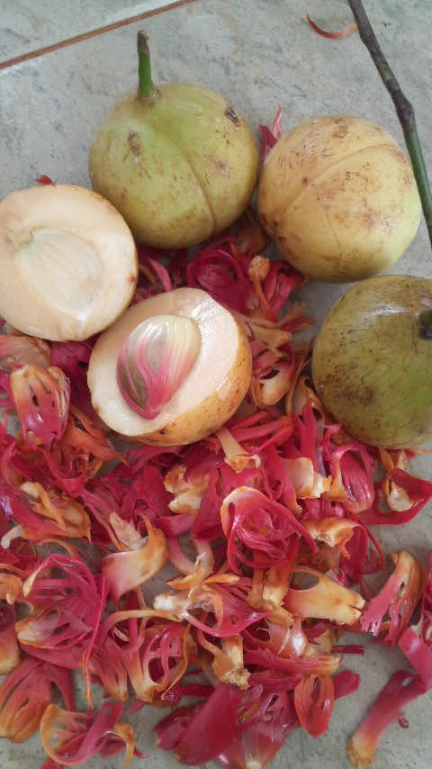 赤いのはナツメグの種の表皮についたメース。お菓子の香りづけなどに使われる少し高級なスパイスです。バリクプラウでは、メースを乾かしている最中でした。