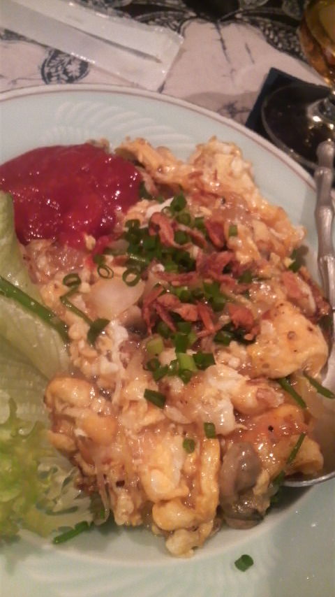 そしてもう一品、これから寒くなる日本で大活躍しそうなオイスター・オムレツOr Jian(オーチェン)。もとは潮州系のお料理ですが、シンガポールやマレーシアの屋台には必ずある人気料理のひとつです。単に生の牡蠣を卵で炒めたものではありません。さつま芋のスターチでとろみを付けるのがコツ。このとろみが牡蠣をふっくらつるりんと、そして卵をふんわり柔らかな食感に仕上げてくれるのです。