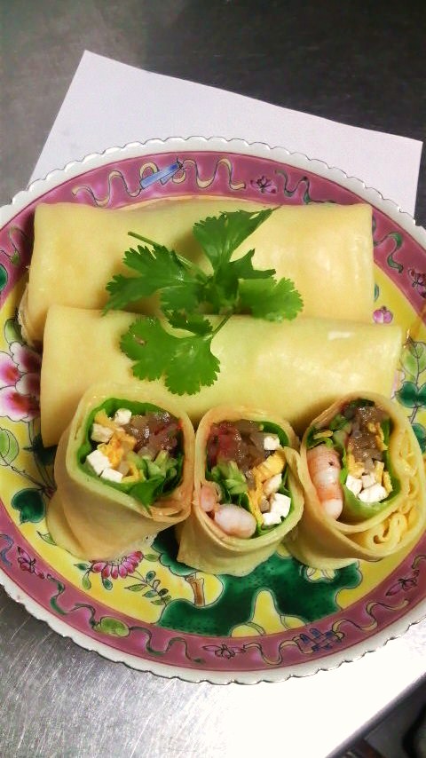 クレープ状に焼いた皮に、様々な具を巻いて食べる見た目も華やかな一品です。