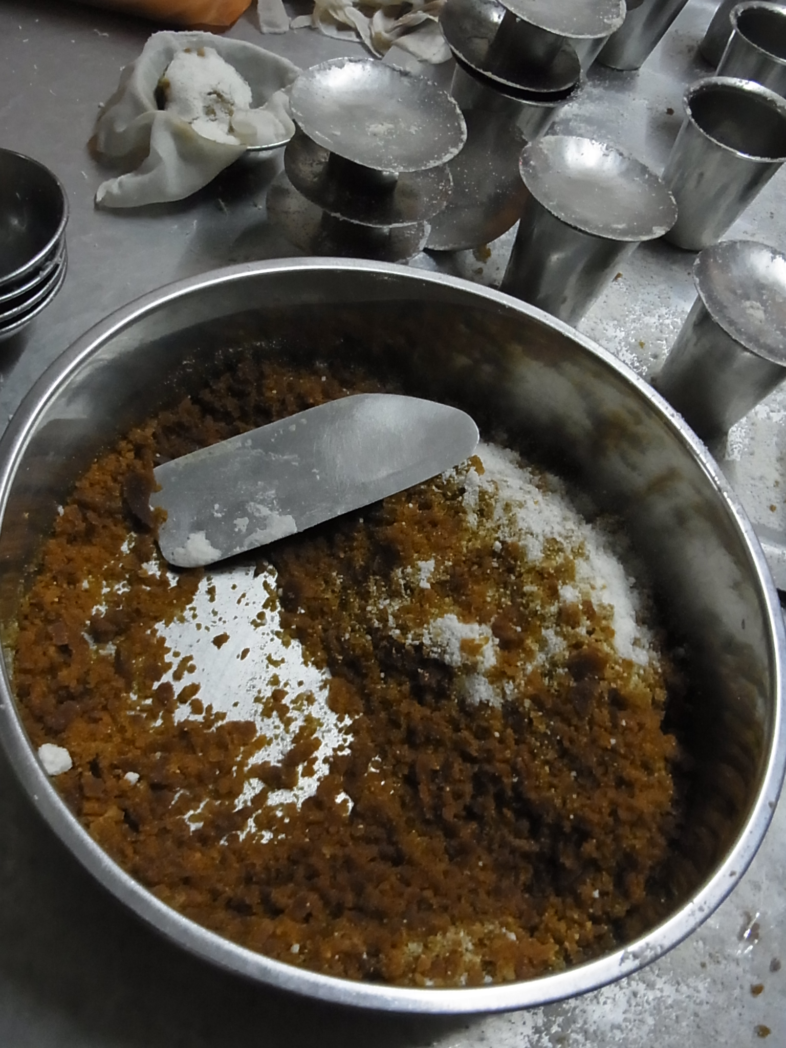 生米を水に浸し天日干しにして砕いて粉状にし、さらに手でぱらぱらになるまで揉んだものを平たい小皿に盛り