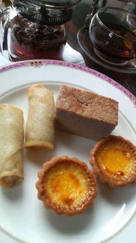 中段はエッグタルトにタロイモをムース状にして蒸し焼きにしたタロイモ・ケーキと、バナナのピューレが入った揚げ春巻き。