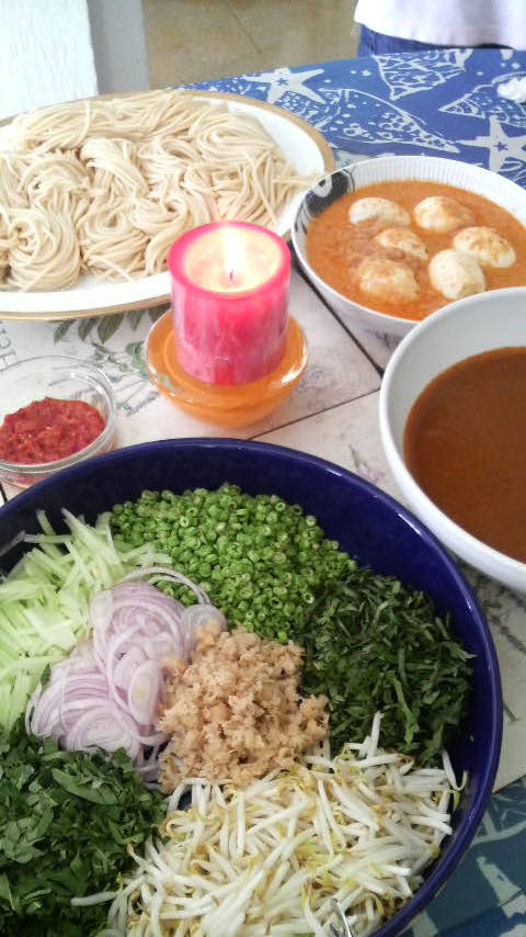 今回、料理の講習にご自宅を提供してくださった90歳になられるというスルタンのご親戚の超美人のお婆様曰く、昔はきちんと麺を手作りしていたそうです。それが段々と作らなくなり、形状の似たスパゲティ麺に変わったとか。今ではJ.Bラクサといえばスパゲティを使用するのが当たり前になりましたが、少し前までは米粉で作られた、にょろりと押し出して作るラクサ麺だったのでしょう。
