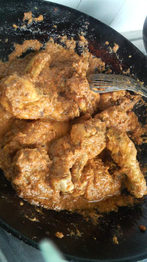 チキン・ルンダンはマリネした鶏をまず唐揚げにし、一度取り出します。その後コリアンダーやフェネルシードといったスパイスに、ブルージンジャーやレモングラスなどのハーブのペーストにチリを加えたものを油で炒め、香りをずんずん油の中に封じ込めていきます。なんとなくインド料理の作り方に似ていますね。そこに先ほどの鶏を投入。