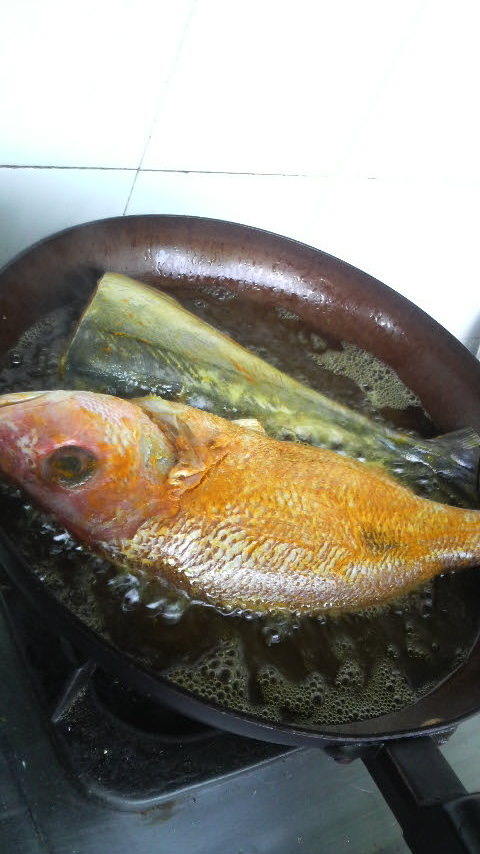 魚料理はイトヨリ鯛に似たものと太刀魚をターメリックと塩でマリネし、素揚げをしたら