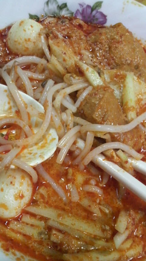 ショップハウスの急な階段を這って上がると、これぞまさにニョニャ・ラクサ!という濃厚でスパイシーなラクサがテーブルの上で湯気を立てていました。