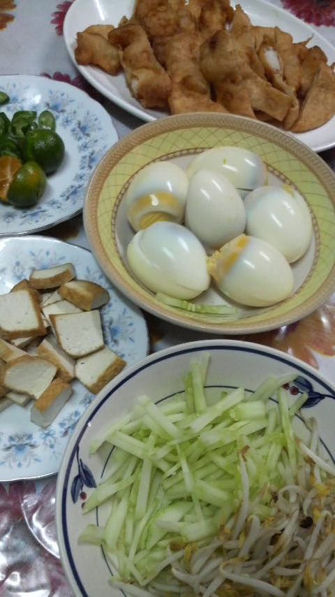 ご覧の通り、テーブルの上にはトッピング用の茹で卵やきゅうりやモヤシ、蝦の擂り身のようなものが入ったフリッターなどが並んでいました。もちろんこのフリッターもホームメイドです。この家には出来合いのものをそのまま使う、ということは無いのです。せいぜい使用する麺くらいでしょうか?