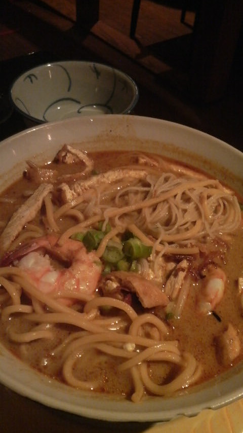一歩入るとまるでバーを改装したようなシックで薄暗い店内。メニューをよーく見るとどこかNYONYAと似た感じ??と思ったらオーナーが同じだったんですね。NYONYA比べるとだいぶメニューは少ないですが、名前を変えてマレーシア料理店を展開するオーナーさんはなかなかやり手のマレーシアン・チャイニーズという訳です。ただ残念なことにPenangという店なのに、アサムラクサが無い!!仕方がないのでカリーミーを注文しました。これがなかなかのヒット!ココナッツミルクが多すぎず少なすぎずちょうど良い塩梅のスープには、きちんとビーフン&イエローミーの両方が入っておりスパイスの良い香り広がります…♪