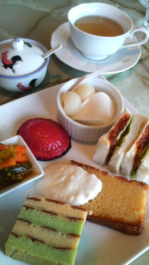 そして甘いものをよりおいしく頂くために欠かせない塩味のアイテムとして、ピリ辛の干し蝦入りのサンドイッチとお店でも人気のニョニャ風ピクルス。ポットで出されるお茶はハーブティーが数種類、ウーロン茶やコーヒーの中から選びます。