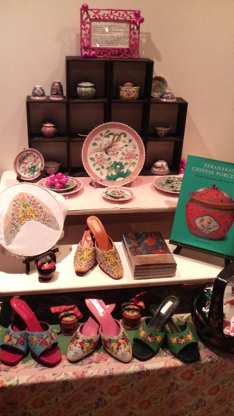 ブースにはプラナカンの陶器(アンティークとレプリカ)、ビーズのサンダル(イエンさんの家に代々伝わる120年前のビーズサンダルも展示されています)、ニョニャバスケットやプラナカン関係の書籍、シンガポール・プラナカン協会の会報誌など、カラフルなものがいっぱい!