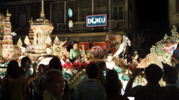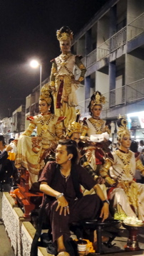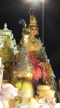 ロイクラトンとは満月の日に灯籠を流したり、熱気球を放つお祭りだそうで、チェンマイでは盛大なパレードがあります。パレードは実はあまり興味がなかったのですが、ねぶた祭りなみの凝った出し物がたくさん出て、踊りのグループなども加わってとても見事なものでした。