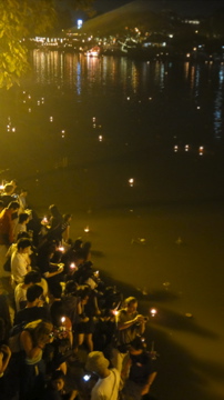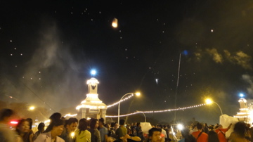 このパレードは旧市街を囲む城壁の一部ターペー門を出発して、ターペー通りをまっすぐ川の方へ向かいます。川の橋のところでは熱気球をあげる人々や川で灯籠を流す人たちがたくさん。灯籠や熱気球は観光客の人たちも買うことが出来、好きな所であげられます。あとそこらじゅうで花火を打ち上げるので結構危なかったですが、こういう派手なお祭りは大好きなので、この時期にあたってとても良かったです。でも一晩中ホテルのそばで打ち上げ花火をあげるのには参りました。朝4時ぐらいにでっかいのがドッカーン、ドッカーンですから。ここもマレーシア同様、好きな所で打ち上げ花火あげさせるんですね。日本やシンガポールじゃ絶対無理。