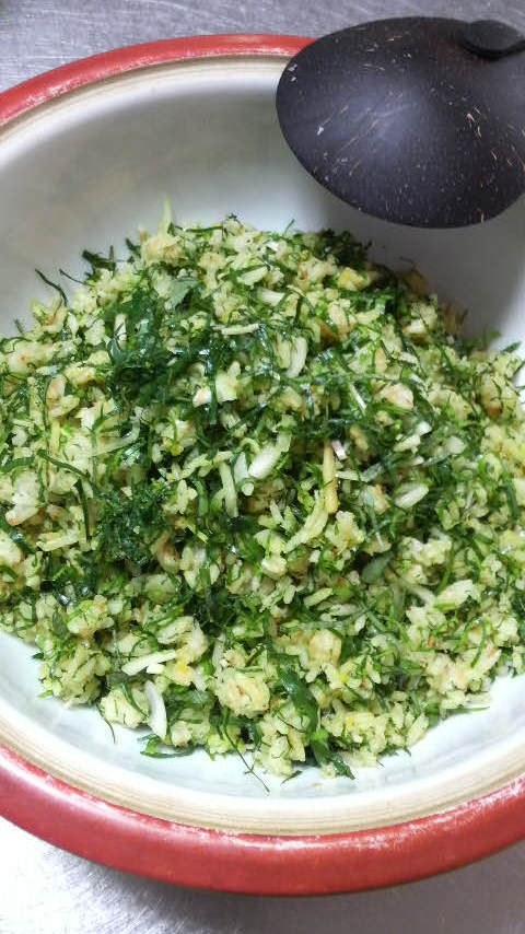 まず、葉っぱ類を一ミリ以下の極細に刻むのがコツ。私を除く仲間の2人は料理のプロでしたので、小気味良い音と共に、みるみるうちに極細になりました。これをご飯に混ぜたら出来上がり!…と思ったら大マチガイ。