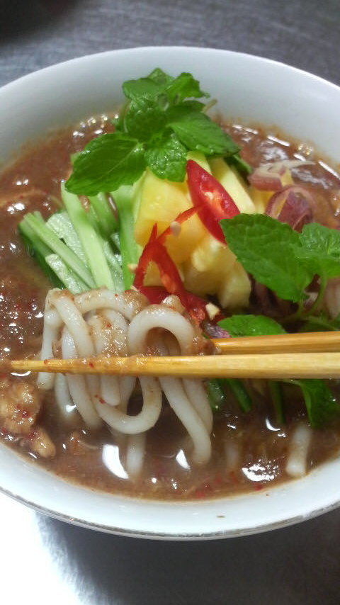 盛り付けにはご覧のとおり生のパイナップルときゅうり、ミントとオニオンを添えます。冷たいきゅうりと暖かい麺のコンビネーションは最初不思議な感じがしましたが、これが酸味のあるスープのアクセントになり、とてもよくあっていました。