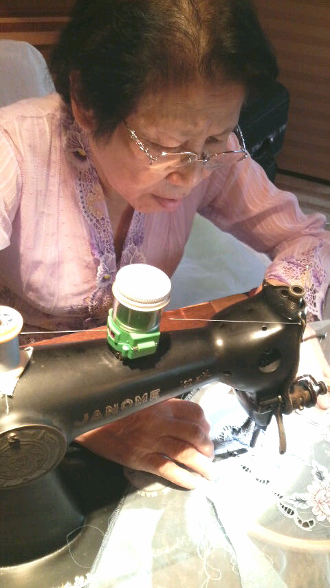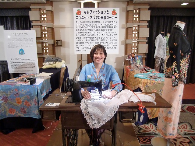 実演はもちろん日本で初めて。デモンストレーションをしてくれたのは王室御用達のクバヤテイラーであり人間国宝リム・スウィーキムさんのお嬢さんコイド・ブン・イエンさん。私たちの本での取材をきっかけにイエンさんと呼んで親しくさせていただいている彼女は、東京の文化服装学院卒業の日本語ペラペラの女性です。