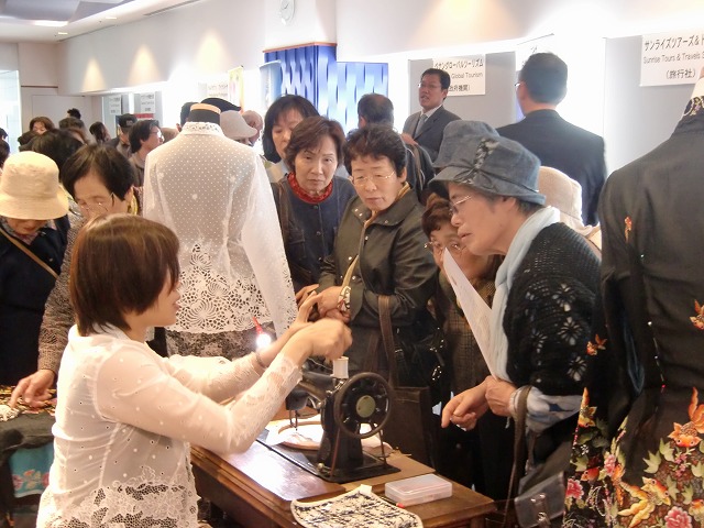 もとはフランスやイギリス刺繍から来たテクニックだそうですが、モチーフの輪郭を縫い上げたら、専用のハサミで中を切り取り、何もない穴の中を糸を往復させ、その糸の上をジグザグ縫いでかがってゆくのです。言葉では説明しつくせませんが、すべてがミリ単位の緻密な作業に、見学の人たちも皆さん『うわぁ~こうやって穴ができていくんだ~』と驚きの声がとびました。百聞は一見にしかずとはよく言ったものですね、お手伝いのはずが自分もすっかり魅入ってしまいました。電動ミシンではできない技だそうですよ。
