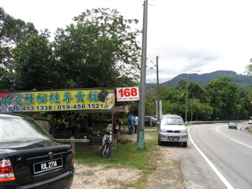 この露店はすぐ裏山がドリアン林になっており、オーナーは客家のファミリーで、常連らしき客から「今何の種類のドリアンがある?」と問い合わせの電話がかかってきていました。つまりこの露店、ドンピシャだったわけです。