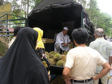 その後Pasir Panjangというビーチに行って遊んだあと、大体目星をつけておいたドリアン露店をめざしたのです。私たちが好きなのは小ぶりのドリアン。そんなドリアンが並び、客の姿がちらほら見える店を選びました。