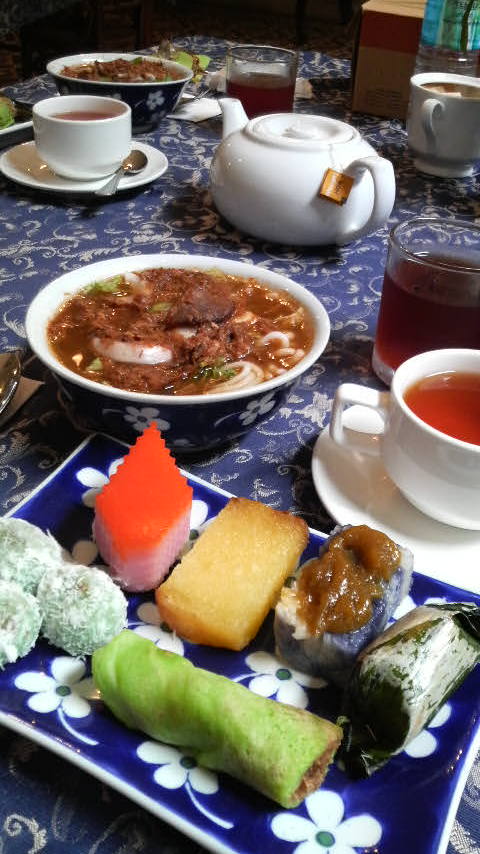 さらに感激は、甘い菓子だけでは途中から飽きてしまわないように、ペナン名物のアサム・ラクサが小ぶりの器にサーブされてきます。魚のダシがしっかりきいた甘酸っぱいスープ麺、アサム・ラクサとニョニャ・クエの組み合わせがこれまた抜群。プラス、冷たいナツメグのドリンクがもれなくと、キャメロンハイランド産の紅茶、もしくはコーヒーがついて、わずか12リンギット!!