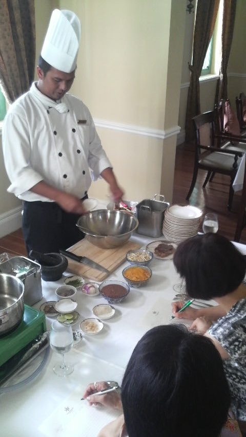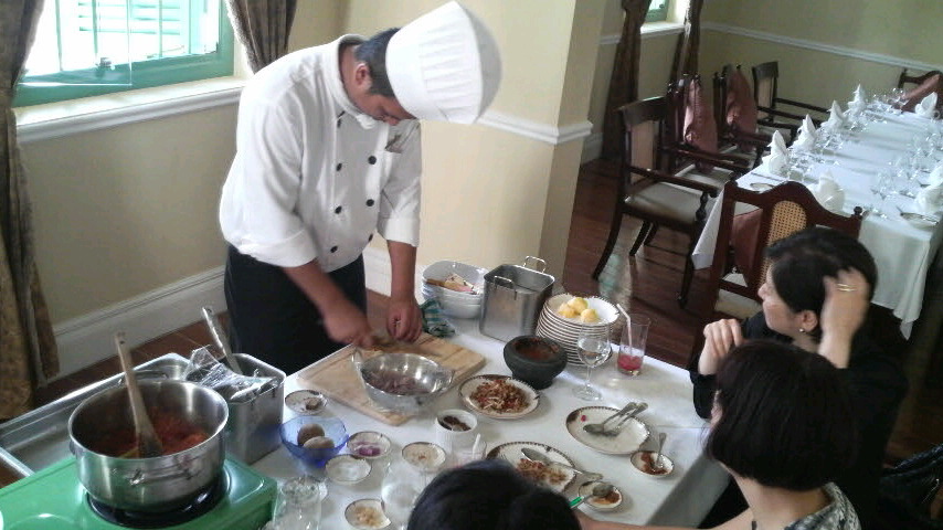 クラスが行われるのはホテルのメイン・ダイニング『ザ、マンション』のプライベートルーム。高い天井に大きく開け放した窓。コロニアルな雰囲気を漂わせる優雅な個室で教えていただくのは、鶏肉とジャガイモの醤油煮こみのアヤム・ポンテーや、ニョニャ風のカリーなど、日本でも作れるメニューを考慮してあります。