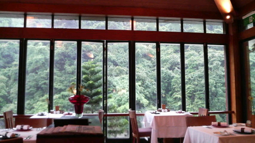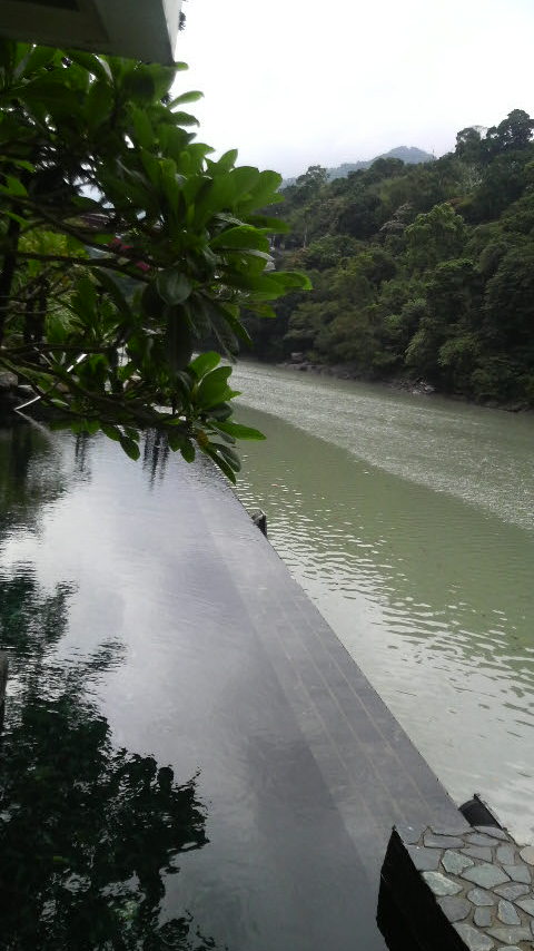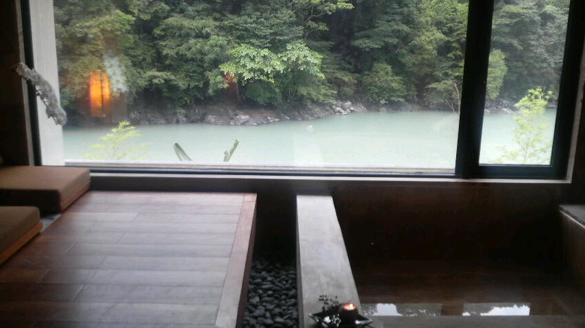 このプールは、ちょうど目線が渓谷を流れる川と緑と一体化し、まるで湖の真ん中にプカ~っと浮いているかのような錯覚に陥る流行りのインフィニティ・プール。深淵たる山の生気を思い切り吸い込み、いつまでも浮かんでいたくなる素晴らしいプールでした。生憎、台風の影響で雨が降りしきり、普段は湖のように静かなエメラルド色の川だそうですが、この日は写真のとおり。それでも充分満喫できました。