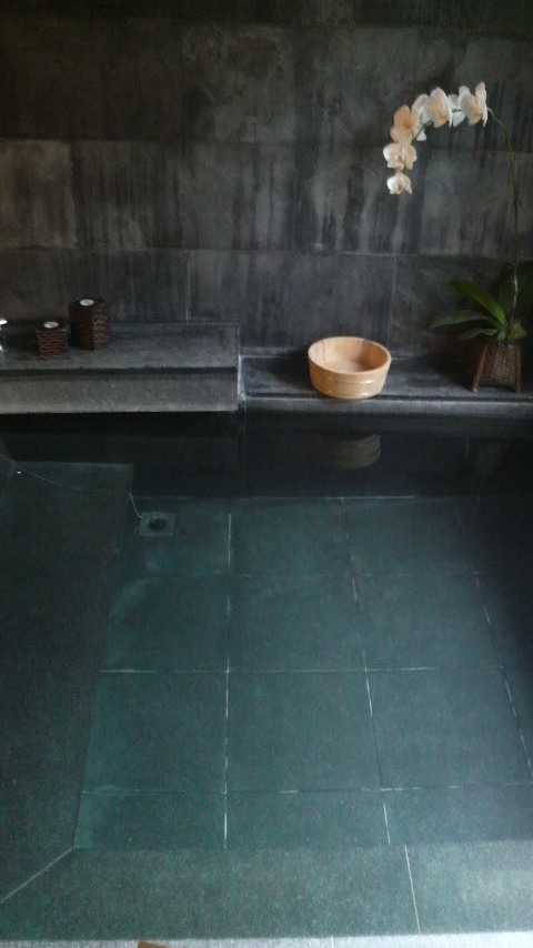 温泉の湯は、美人湯として名高い弱アルカリ性炭酸泉で、客室以外にも、もちろん大浴場や露天風呂も完備(日本式に裸で入ります)。お風呂回りの設備の充実はさすが5つ星ホテル。女性には嬉しいリラクゼーション・エリアも立派なものでした。中でもプライベート・ガーデン付きのスイート・ルームは、南勢渓に並んで設計された温水プールにそのままドボーン!と入ることができる贅沢な造り。