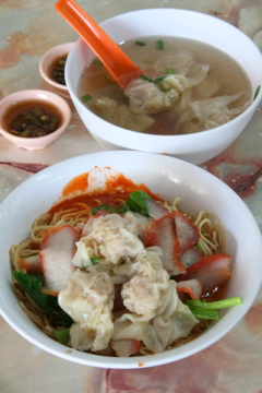 ワンタンは蝦と豚ひき肉をベースとした餡を小麦粉の皮に包んで茹でたもの(ペナンでは店によって揚げたものを入れるところも)。これは基本的には香港あたりと同じですが、香港の味を知っている人には物足りない出来と言わざるをえません。